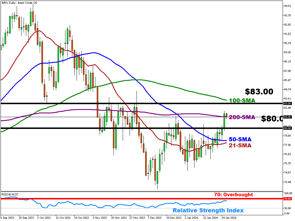 • 200-period SMA (~$81.378) is set to offer an immediate support, followed by the psychologically important $80/bbl