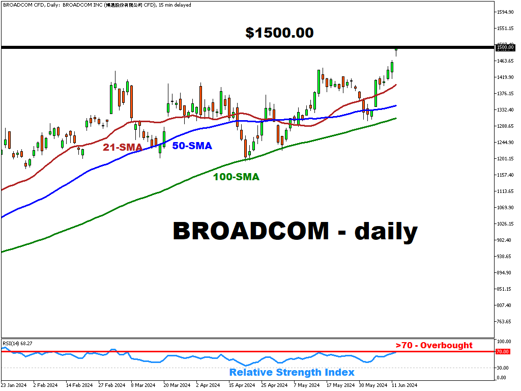 Broadcom’s stock has reached a new milestone by briefly touching $1503.46 following the better-than-expected earnings report for Q1 2024.