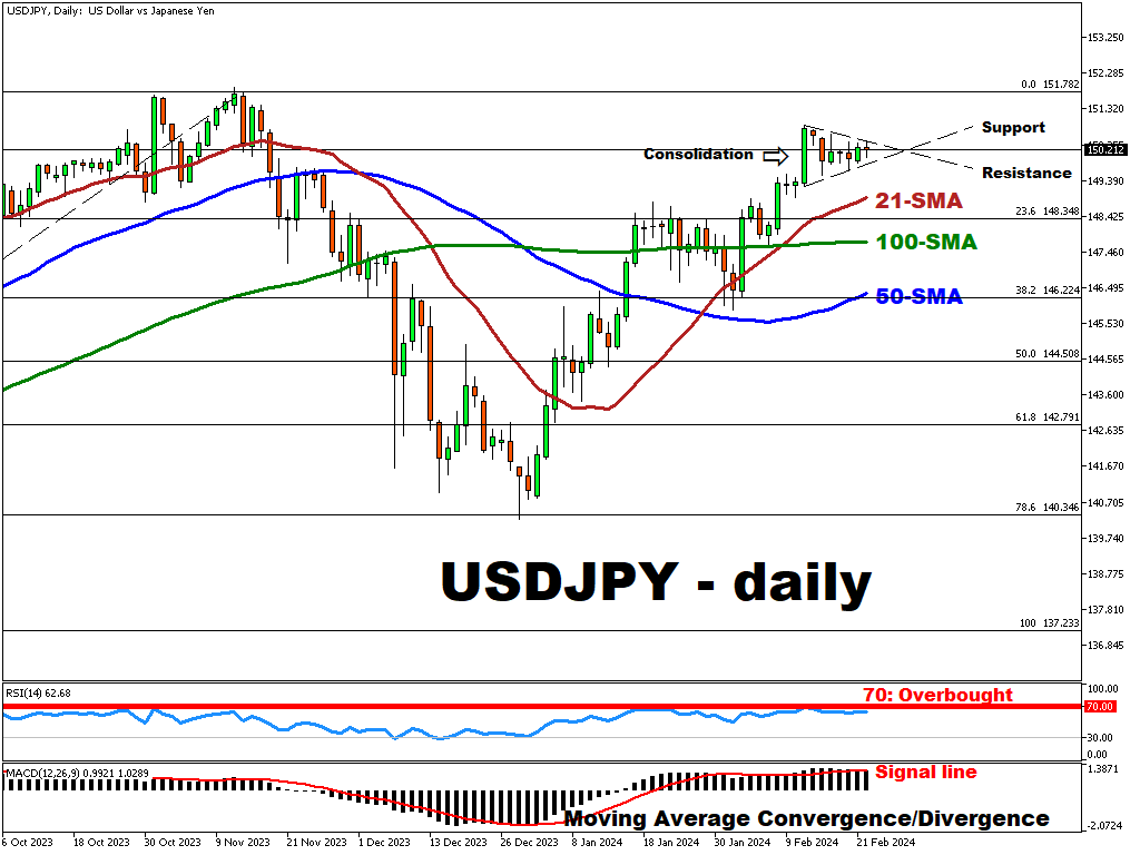 While the price sits above all key moving averages (21, 50 and 100-SMAs), indicating a potential bullish momentum, USDJPY is currently encountering hurdles at the ~150.00 psychological level.