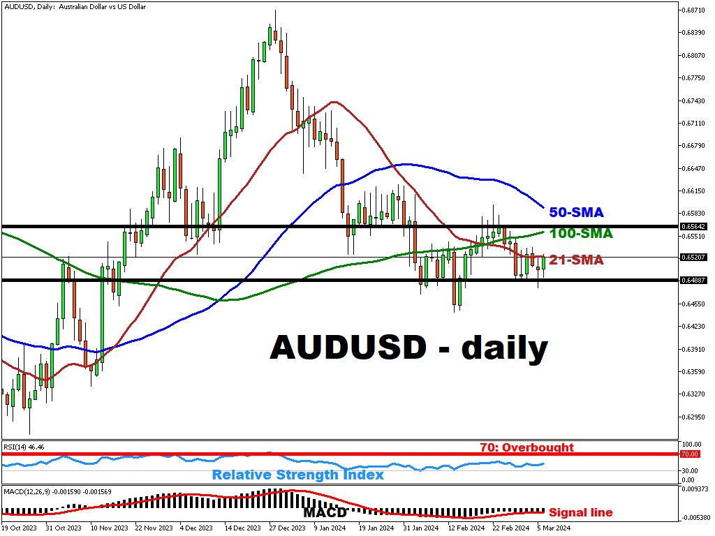 AUDUSD is currently trading below all three key simple moving averages (21, 50 & 100-period SMAs), indicating a potential downtrend.
