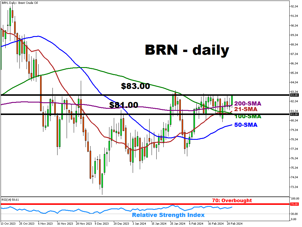 Brent crude briefly dipped below its 200-period Simple Moving Average (SMA) of $81.913/bbl on Thursday, March 29th, before rebounding to $83/bbl per barrel following the release of the US Personal Consumption Expenditures (PCE) data.