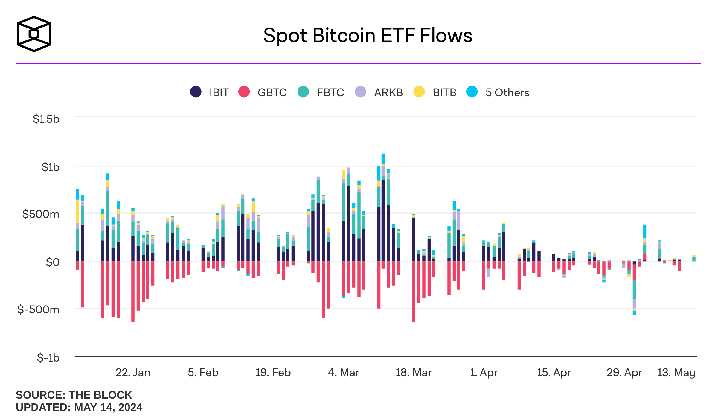 Despite the pressure from the market's uncertainty about the Fed's future moves, BTC Spot ETFs are showing resilience in terms of funds flows. On Monday, May 13, total net inflows reached $66 million.