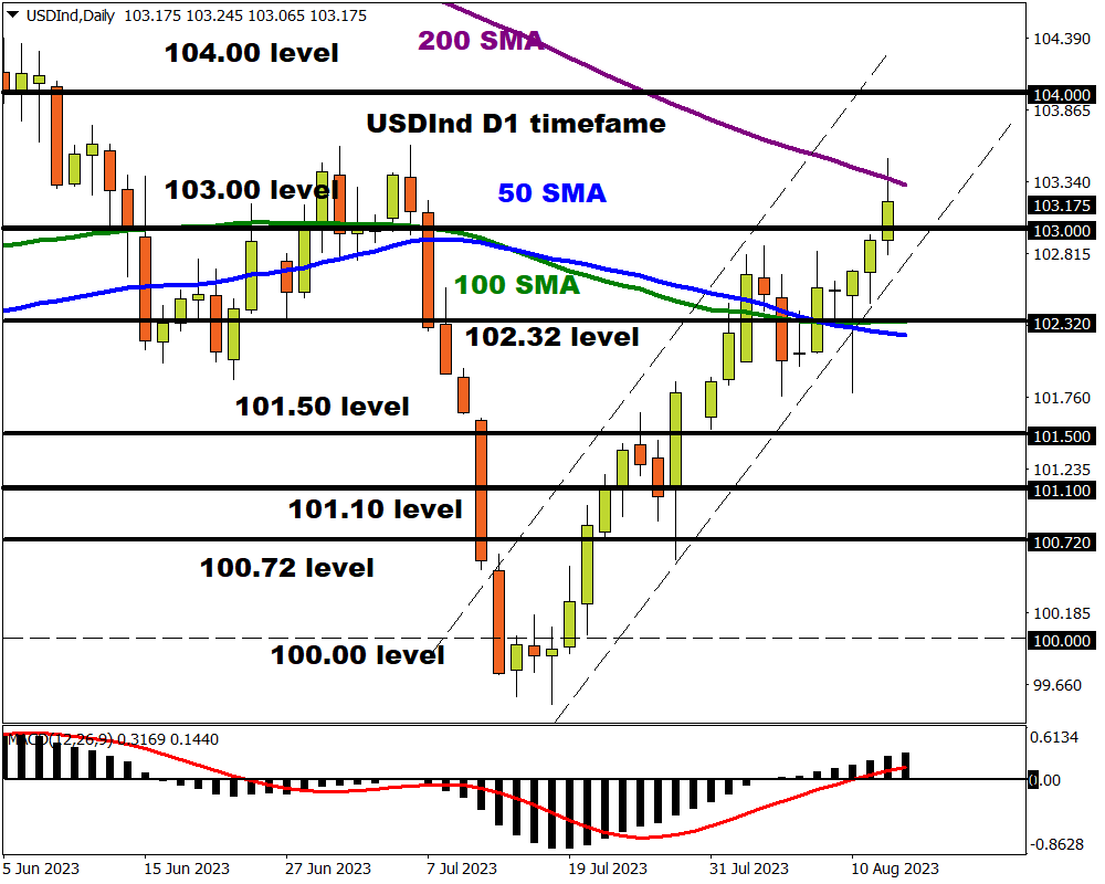 All eyes will be on the US retail sales figures later today which could add another piece to the puzzle that determines whether the Fed hikes one more time in 2023 or not. On Wednesday, the Fed minutes might also offer key clues on the central bank’s next policy move. Traders are currently pricing in only an 11% probability of a 25-basis point hike at September’s FOMC meeting, with this rising to 40% by November, according to Fed funds futures. The dollar is likely to weaken if the data is softer or the minutes strike a dovish tone. Any hint from the hawks or signals of more hikes down the road could boost the dollar.