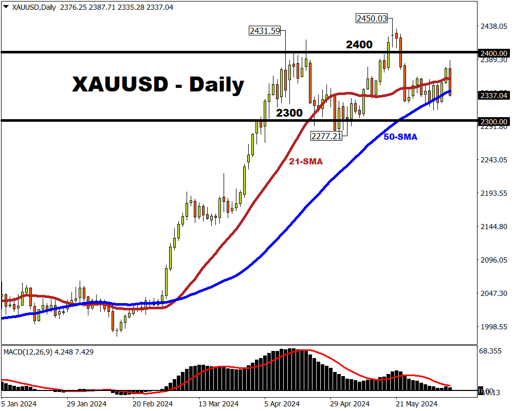 - Stronger-than-expected hiring and wage growth, which in turn further delays Fed rate cuts, might prompt the precious metal to move even closer to $2300.