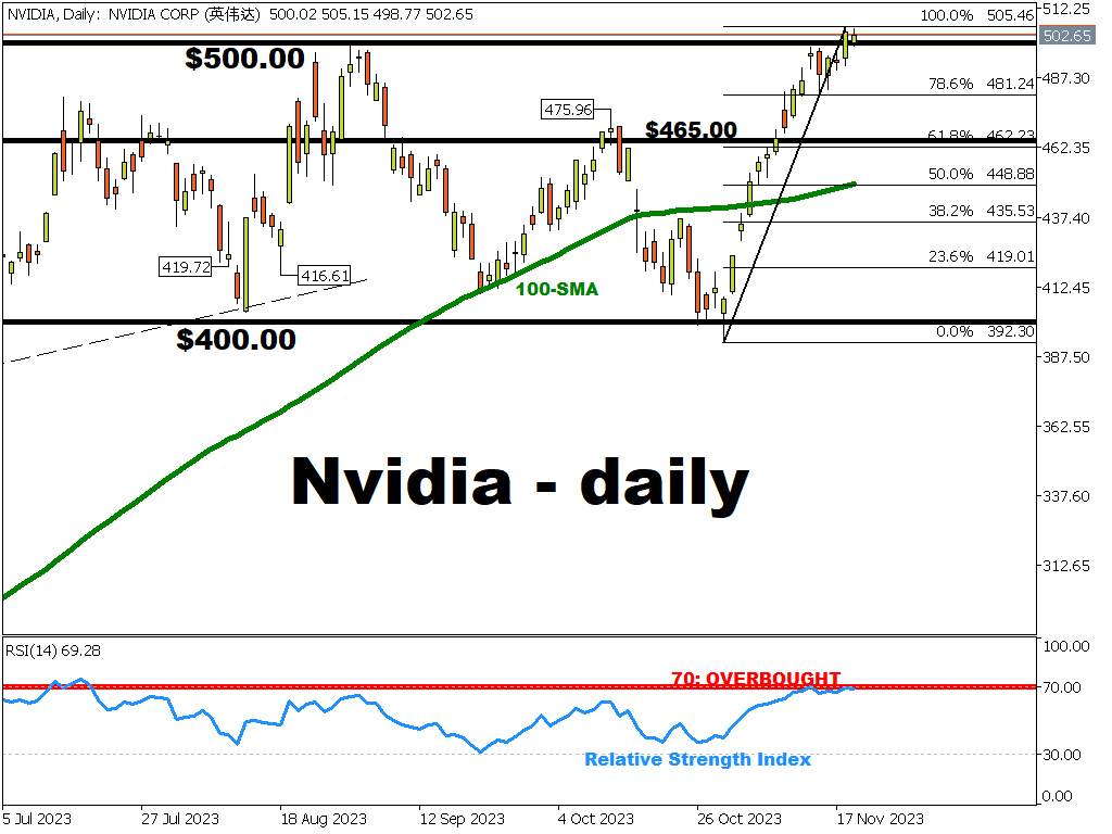 • A 7% move to the upside on Wednesday (depending first on whether this stock ends today above or below the $500 line) could see Nvidia’s stocks trading around $535 when US markets reopen.