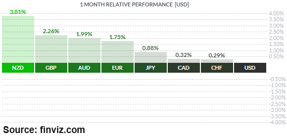NZD has outperformed all its major peers during the past 30 days, rising more than ~3.81% to the US dollar.