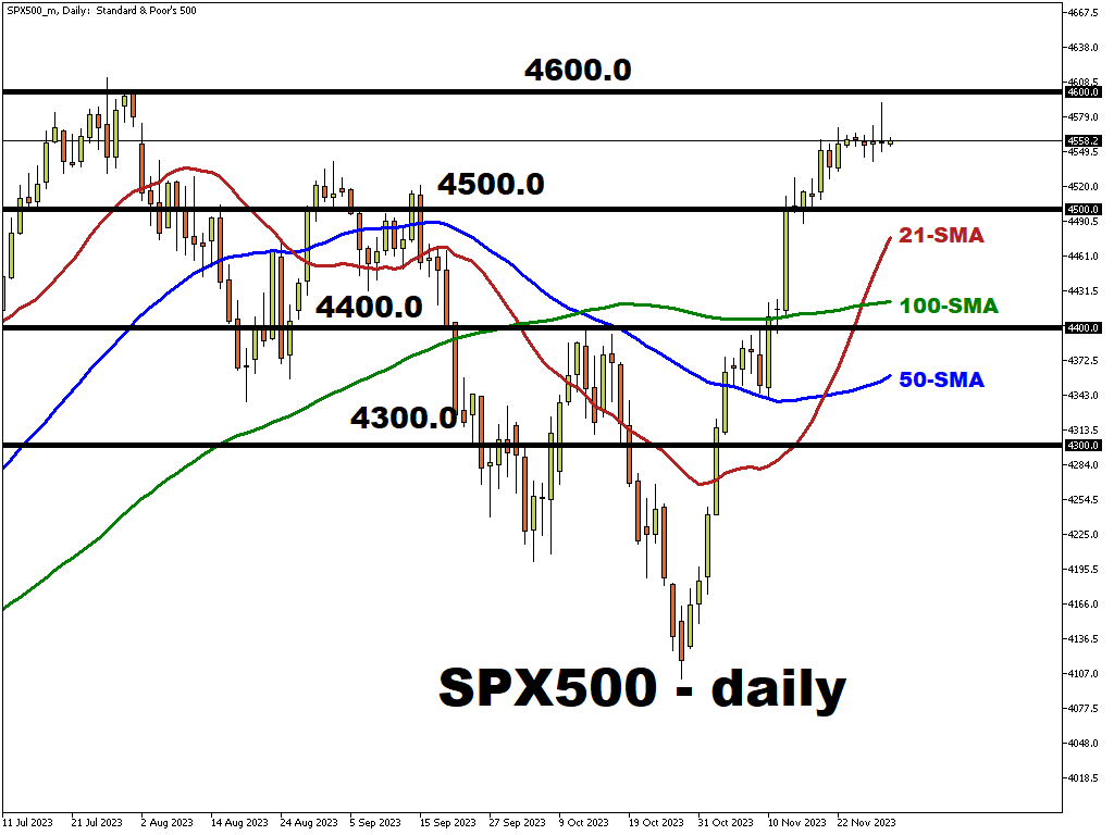 • But price have been overbought so a correction is due. Bulls are eyeing up the summer top in the S&P 500 above 4,600 as thoughts turn to a classic Santa rally