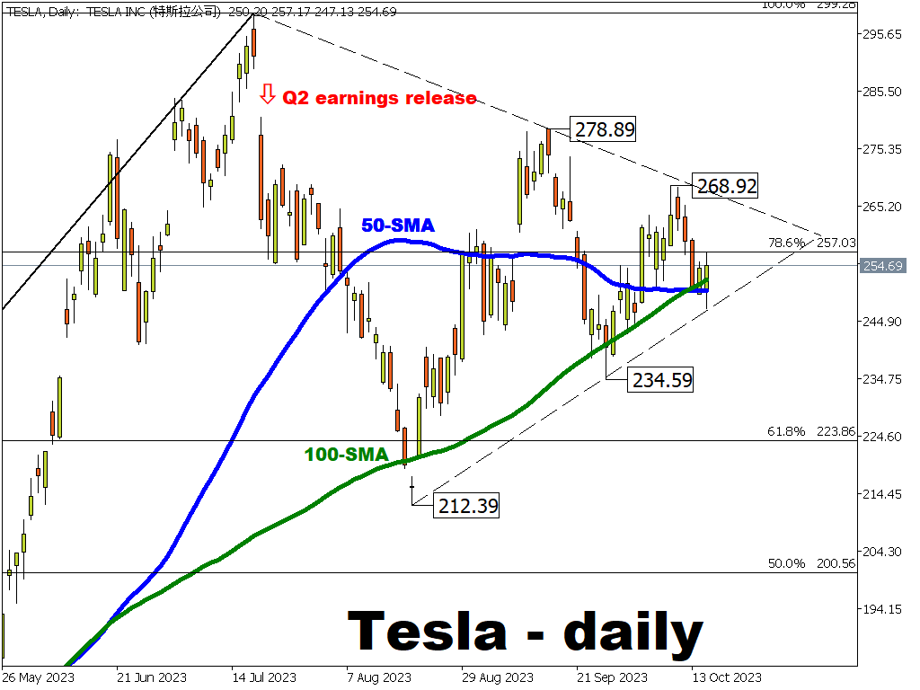 From a technical perspective, Tesla’s stocks have been squeezed into a symmetrical triangle.