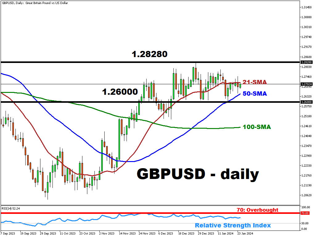 GBP remains in a 1.26 to 1.2828 range. Support for the pound has come from the paring of rate cut bets, which now predict less than 100bps this year.