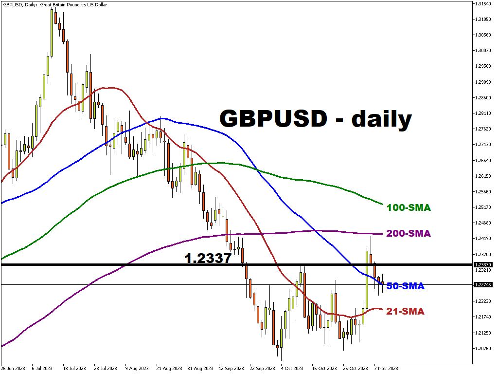 Monday’s high touched the 200-day SMA at 1.2433 before a sharp retracement.