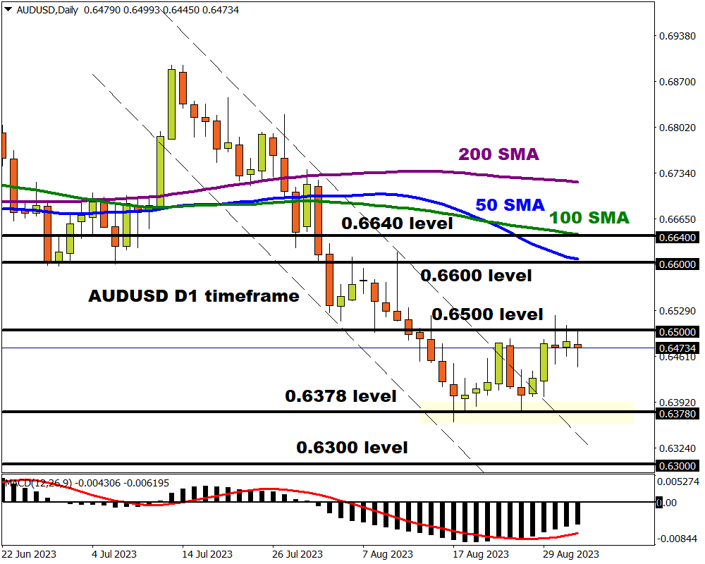In the meantime, prices trading within a range with support at 0.6378 and resistance around 0.6500. Interestingly, the currency pair is trading well below the 50, 100, and 200-day SMA while the MACD also trades to the downside.