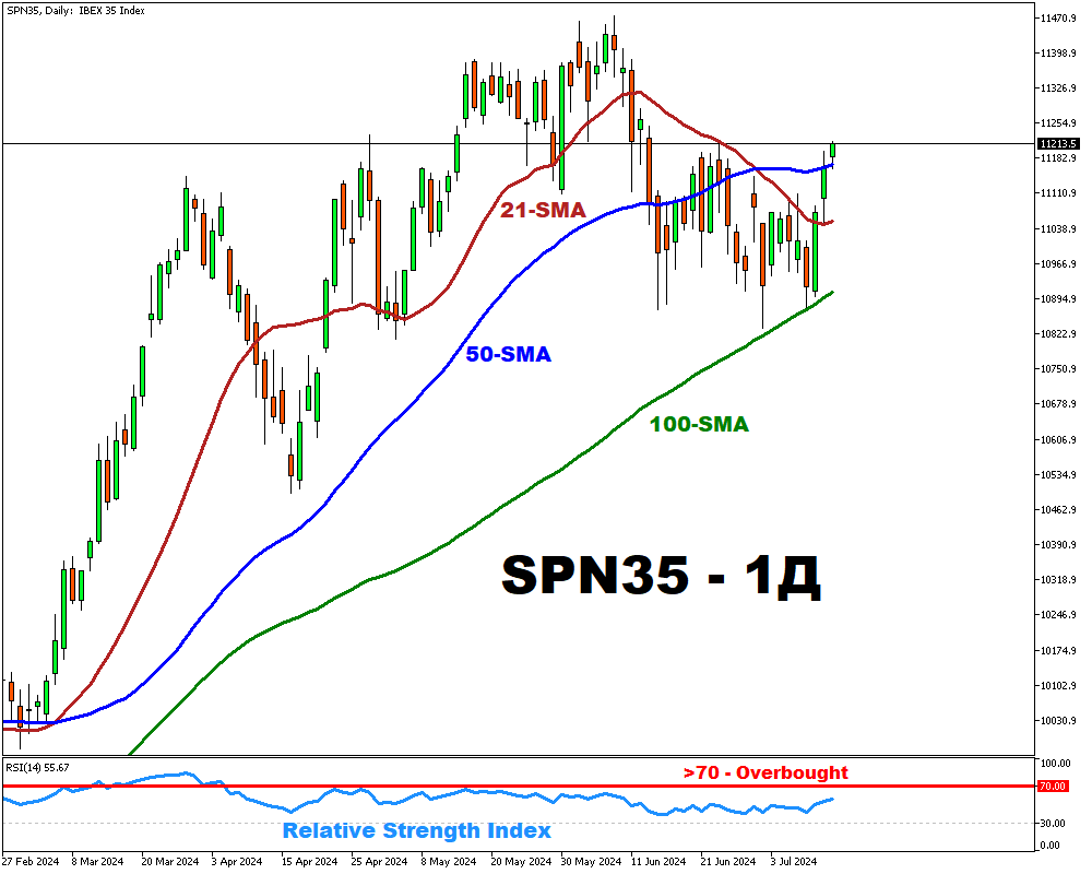 На текущий момент среди фондовых индексов двух финалистов Евро 2024, индекс SPN35 опережает UK100.